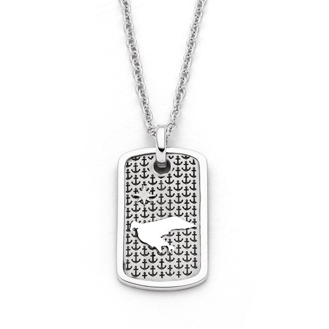 Flacher, rechteckiger Ankerplatz Anhänger "Borkum" mit dem silbernen Motiv "Inselsilhouette von Borkum" und gelaserten, schwarz oxidierten "Anker" Icons im Hintergrund, aus 925er Sterlingsilber.