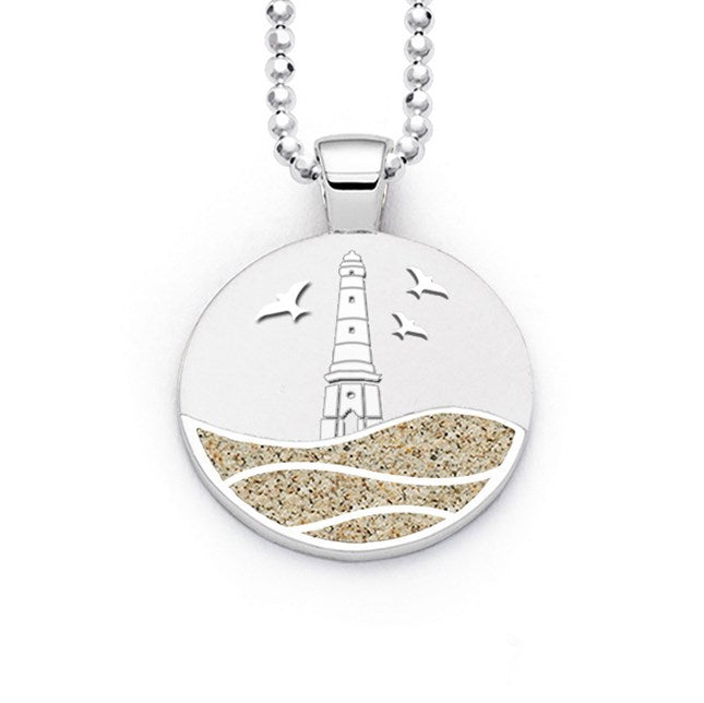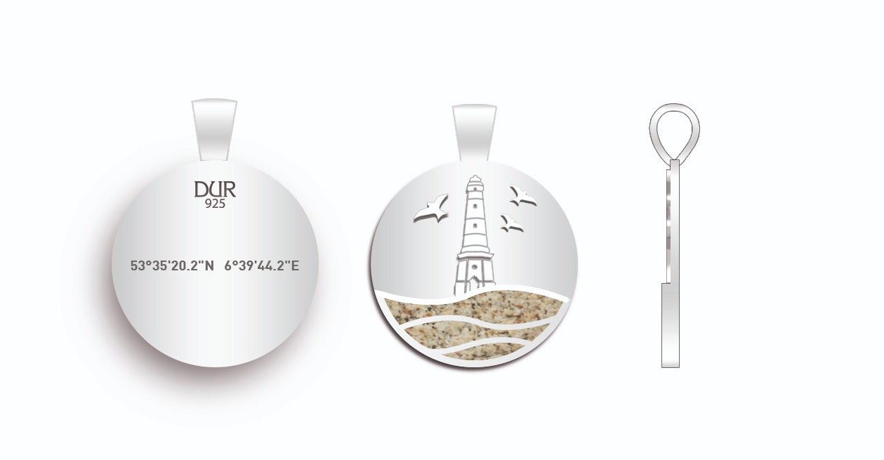 Runder Anhänger Strandwellen "Borkum" mit den Motiven: -Leuchtturm-Möwen-, die Wellen sind eingebettet in Strandsand, die Koordinaten des neuen Leuchtturmes (53°35'20.2''N 6°39'44.2''E) sind eingraviert auf der Rückseite alles gefasst in poliertem, rhodiniertem 925er Sterling-Silber.
