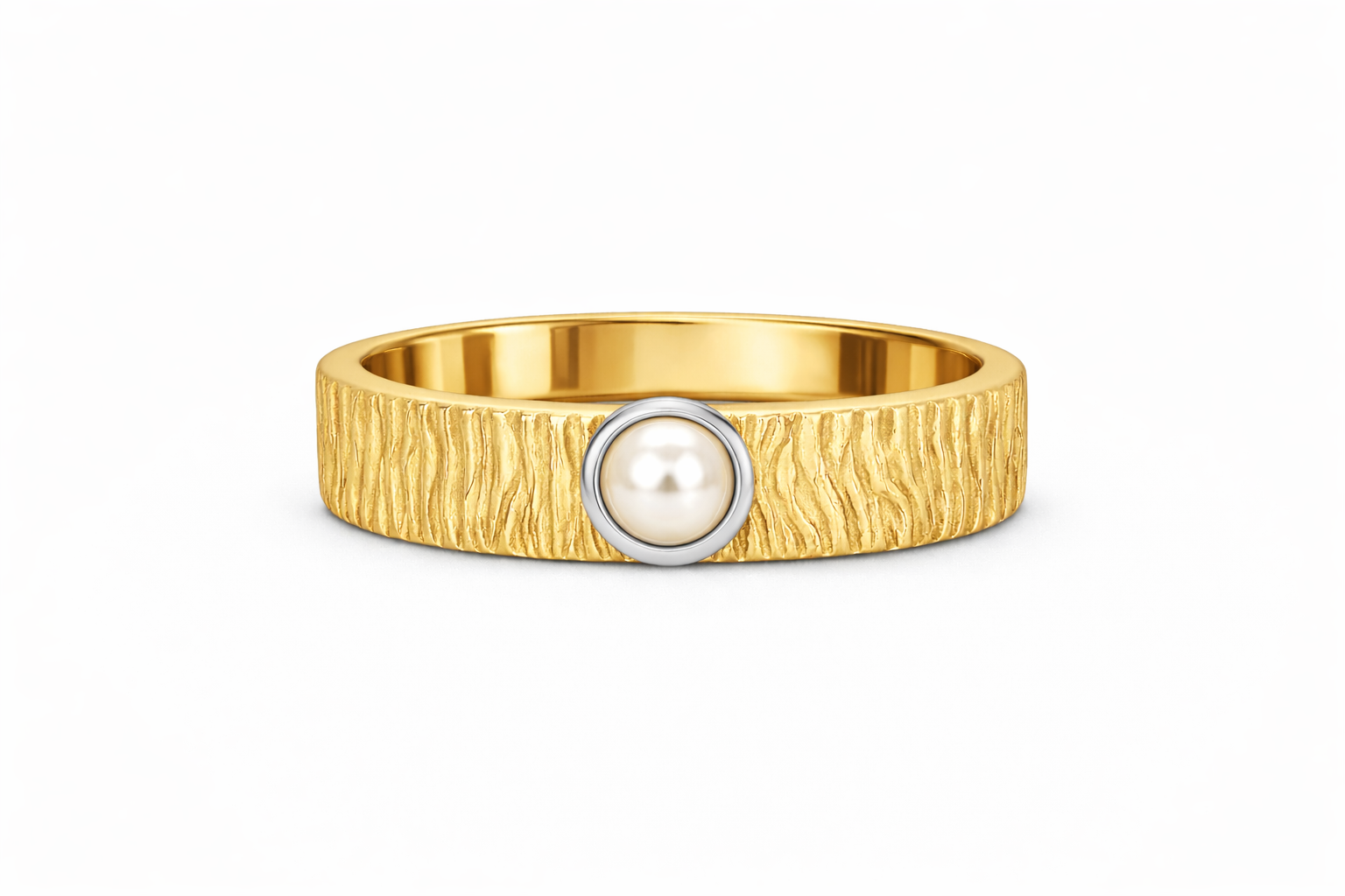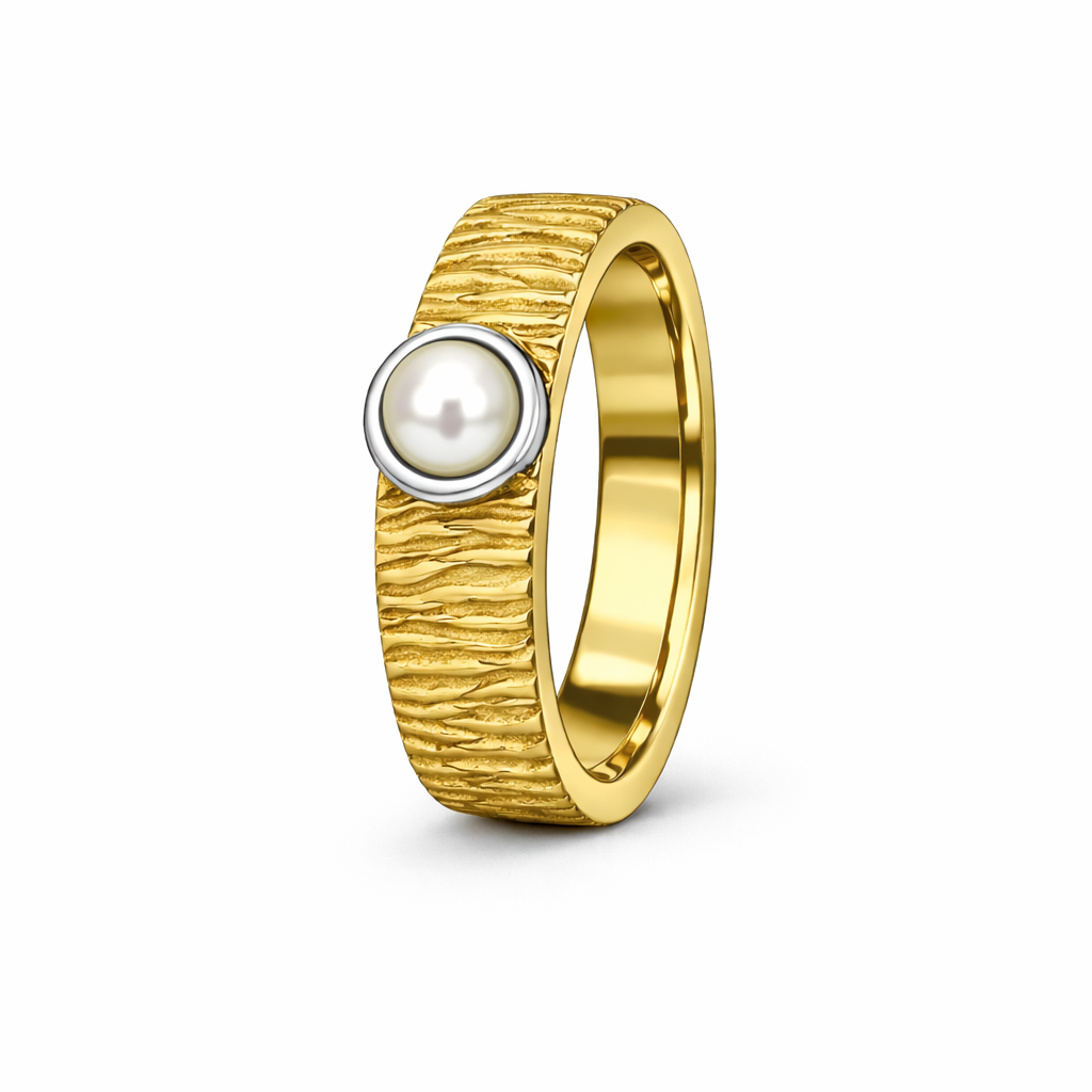 Der Gezeitenring mit Perle verbindet kraftvolle Struktur mit klassischer Eleganz. Die charakteristische, von Wind und Wellen inspirierte Oberfläche verleiht dem Ring eine lebendige, handwerkliche Optik, während die zentral gesetzte Perle für Ruhe, Harmonie und zeitlose Schönheit steht.